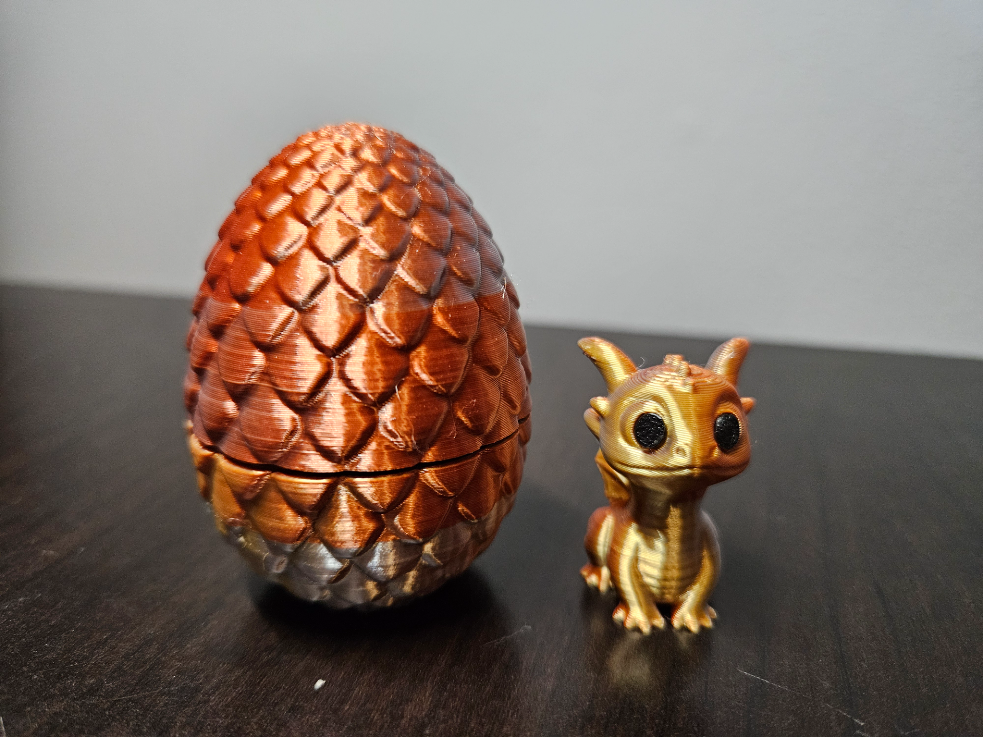 This captivating 3D-printed model features a beautifully textured dragon egg that unscrews to reveal a tiny, articulated baby dragon nestled inside! This item serves as both a fantastic display piece and a highly satisfying fidget toy.